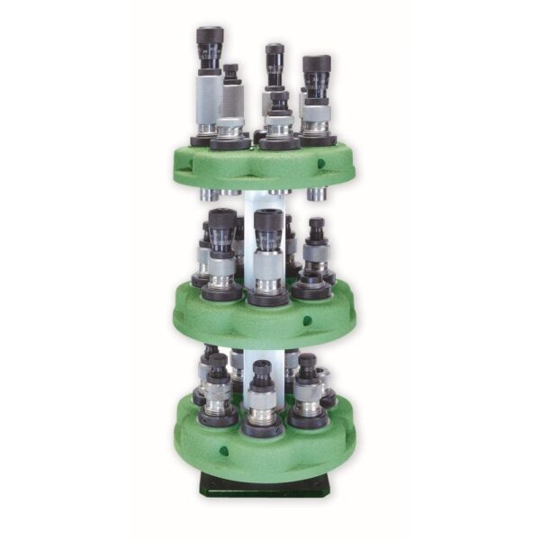The Redding Turret Stacker is a convenient system for storing extra turret heads. Supplied with an assortment of spacers allowing up to three turrets to be stacked with dies installed thus preserving their adjustment. This system also prevents damage to decapping rods and pins when dies are not in use.